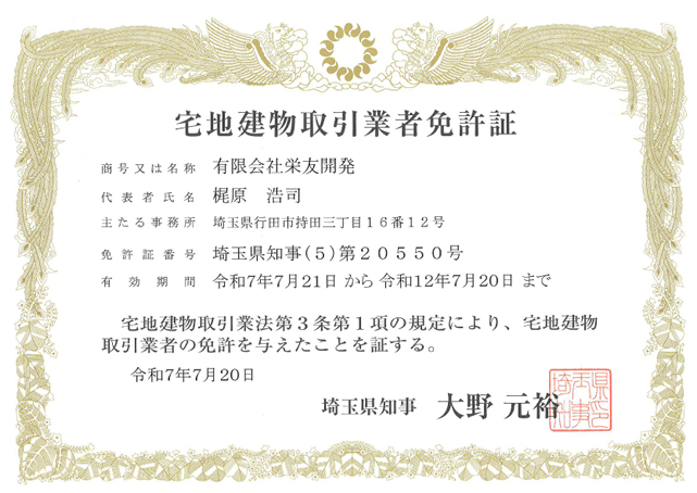 | 関連会社 | 有限会社 栄友開発(不動産取引) (社)埼玉県宅地建物取引業協会会員 (社)全国宅地建物取引業保証協会会員 (社)首都圏不動産公正取引協議会加盟 埼玉県知事免許(5)第20550号 |